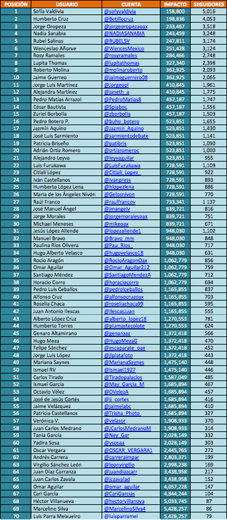 El cálculo general está basado y consultado en el índice: TWEET GRADER, cuyo cálculo es sobre 12,793,991 de cuentas, así que mientras más cerca al 1, es mayor el impacto. Como se podrá notar algunos de los enlistados tienen un mismo cálculo y así se ha respetado. Seguramente en la siguiente medición éste cambiará.