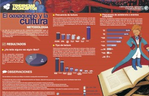 Por ello, Conceptos Marketing nos ha compartido EN EXCLUSIVA para nuestros usuarios, los resultados de un sondeo de opinión muy concreto sobre LECTURA EN OAXACA y asistencia a actividades culturales, efectuado los días 26 y 27 de octubre de 2012. Las anotaciones metodológicas respectivas y los resultados se encuentran en la Infografía siguiente: