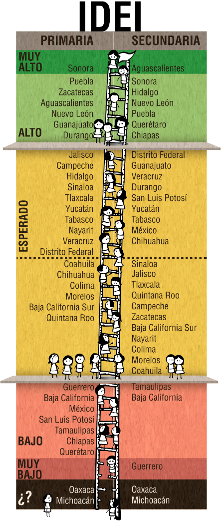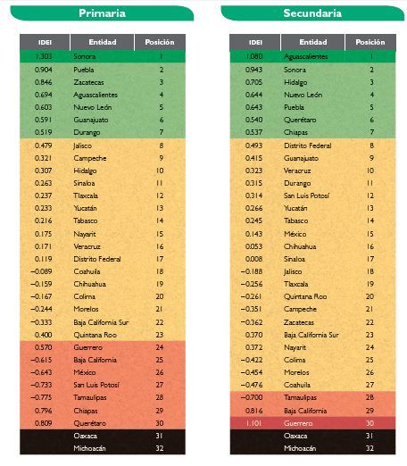 En este ranking, Oaxaca y Michoacán se ubicaron en el lugar 31 y 32 respectivamente, tanto a nivel primaria como secundaria. Los estados de Sonora, Puebla y Zacatecas ocuparon los tres primeros lugares en el ranking de primaria mientras que a nivel secundaria Aguascalientes, Sonora e Hidalgo ocuparon dichos puestos.