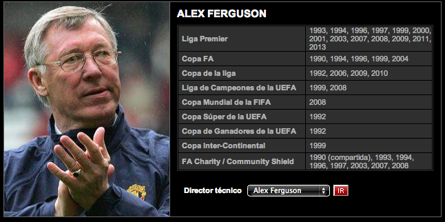 Ferguson es el director técnico más exitoso de la historia del fútbol al haber ganado más de 30 trofeos durante su largo período a cargo de los Rojos. Ha obtenido 13 títulos de Liga, cinco Copas FA y dos Ligas de Campeones.