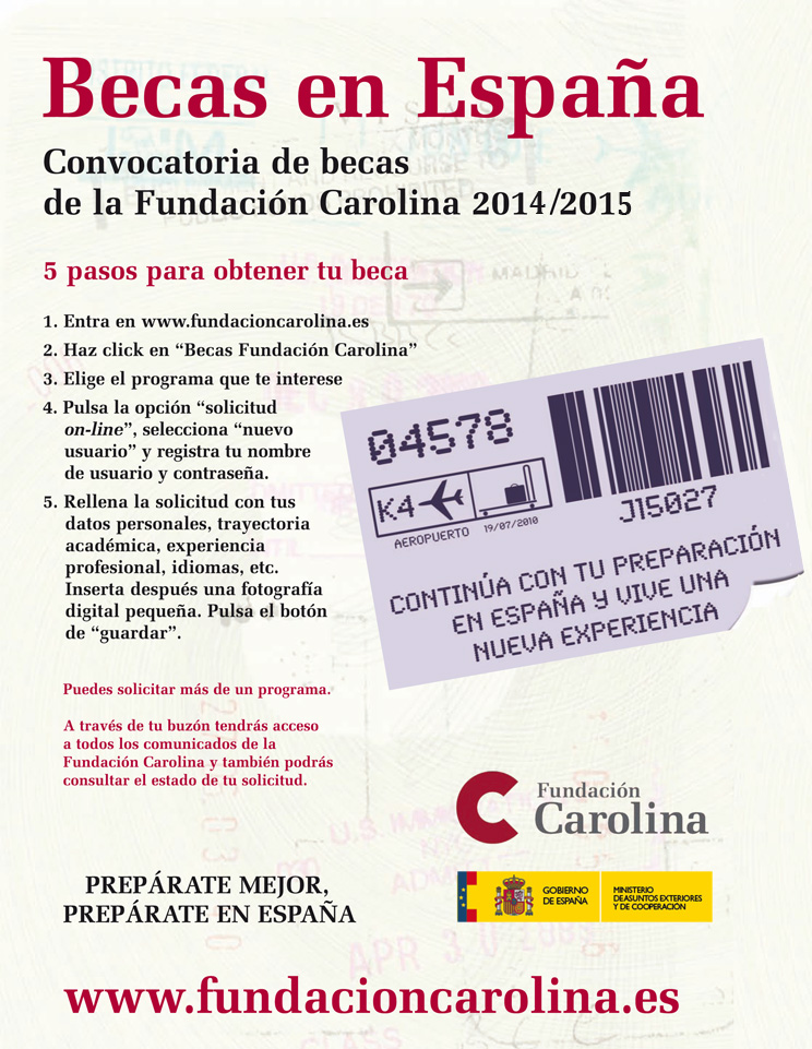 La Fundación Carolina ha abierto una nueva edición de su convocatoria de becas, correspondiente al curso académico 2014-2015. En esta 14ª edición se ofertan un total de 523 becas, distribuidas en cinco modalidades: 309 becas de postgrado, 50 de doctorado y estancias cortas postdoctorales, 34 becas de movilidad de profesores brasileños, 50 de la Escuela Complutense de Verano, 13 becas de proyectos al emprendimiento y 67 de renovaciones de becas de doctorado y becas de postgrado de segundo año. La convocatoria cubre la totalidad de las áreas de conocimiento y está dirigida en exclusiva a estudiantes de todos los países de Iberoamérica para que completen su formación en España.