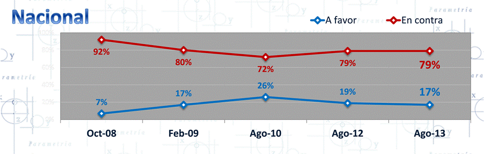 Cuatro de cada cinco mexicanos, es decir, 79% de la población a nivel nacional, está en contra de la legalización de la marihuana y uno de cada cinco, 17%, se declara a favor, así lo dio a conocer la agencia de investigación Parametría tras realizar una encuesta de opinión, luego de que el tema de la legislación en materia de su consumo y venta saliera nuevamente a discusión en la mesa de debate de México.