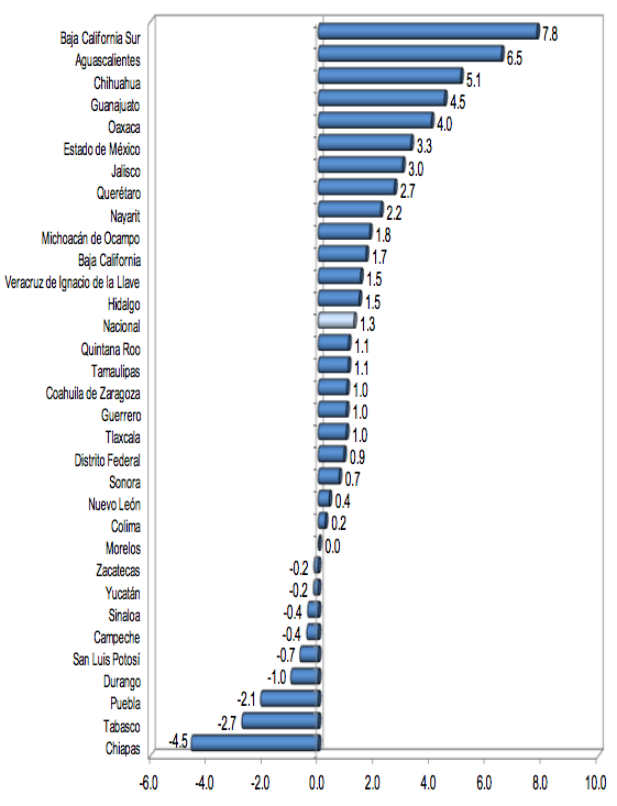 Los dos únicos estados a nivel nacional y regional que presentaron una reducción en las actividades terciarias fueron Guerrero con -0.4% y Chiapas con -0.8%.