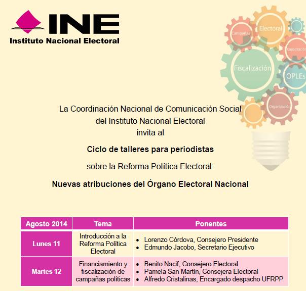 El Instituto Nacional Electoral, ofrece un Ciclo de Talleres para Periodistas sobre la Reforma Político Electoral. El día de hoy, el Taller Financiamiento y Fiscalización de Campañas Políticas, a cargo de los consejeros electorales Benito Nacif y Pamela San Martín, así como el encargado del despacho de la Unidad de Fiscalización de los Recursos de los Partidos Políticos, Alfredo Cristalinas: