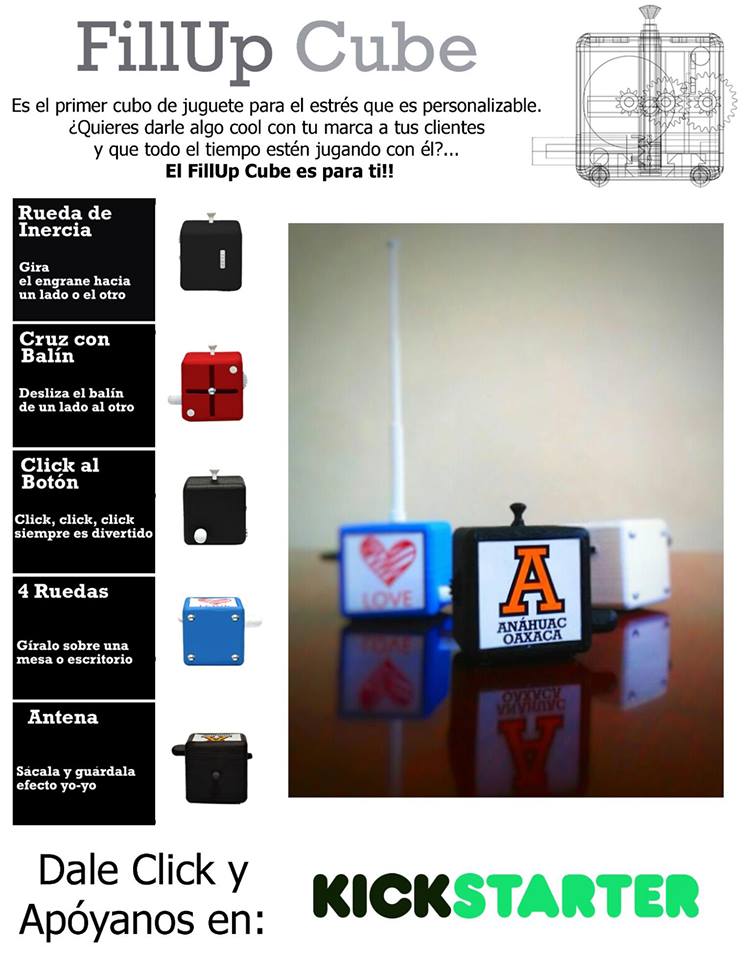 19 de mayo de 2017. Bajo la plataforma Kickstater que busca que todo proyecto debe crear algo nuevo que pueda ser compartido con los demás. Con un claro objetivo, como por ejemplo grabar un disco, publicar un libro o realizar una obra de arte y al final del proceso, el proyecto se concretará y se producirá algo. El abogado y empresario oaxaqueños Enrique Alejandro Toro Torres ha desarrollado el proyecto denominado FillUp Cube. Se trata del primer cubo de juguete para el estrés que es personalizable.