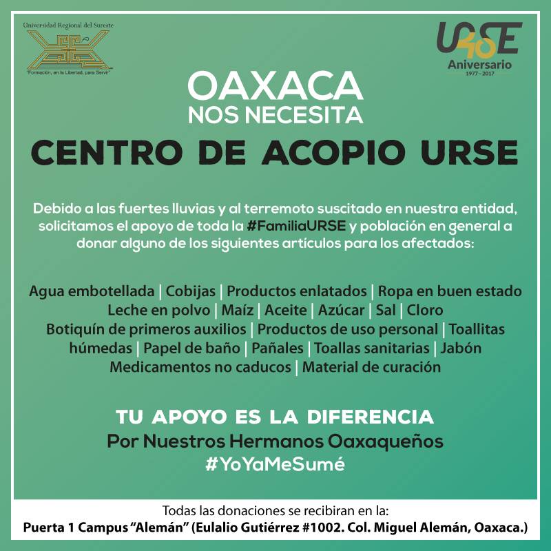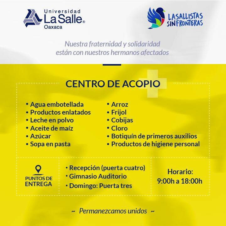 Como un gesto de solidaridad instituciones educativas se han sumado a la recolección de donaciones, tal es el caso de La Salle Oaxaca en un horario de 9 de la mañana a 6 de la tarde, la Universidad Regional del Sureste (URSE) en un horario de 9 de la mañana a 2 de la tarde. La Universidad Anahuac Oaxaca y la Universidad Mesoamericana se unirán de igual forma a esta causa a partir de este lunes 11 de septiembre.