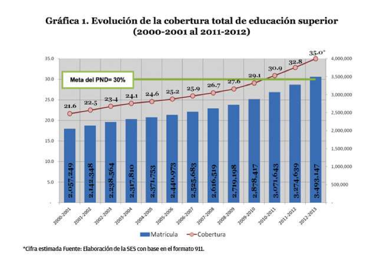 Respecto a la matrícula total de jóvenes en educación superior, se indica que en el ciclo escolar 2006-2007 alcanzó alrededor de 2 millones 525 mil estudiantes (sin incluir el posgrado), en 2011-2012 se situó en cerca de 3 millones 274 mil y se prevé que en 2012-2013 alcanzará una cifra cercana a 3 millones 500 mil. Es importante señalar que la mayor parte del incremento de la matrícula durante los últimos seis años se produjo en la modalidad escolarizada.