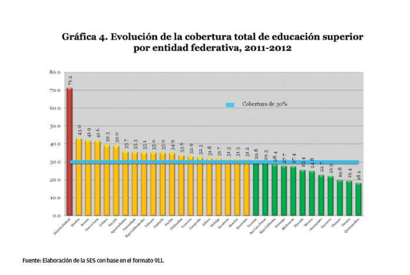 El informe señala que a pesar de los avances logrados en los últimos seis años, en la educación superior sigue habiendo un enorme rezago en materia de cobertura. El Distrito Federal fue la única entidad en el ciclo 2011-2012 que se situaba en la etapa de “universalización”, con poco más de 70 por ciento de cobertura bruta, mientras que 12 entidades tenían un número menor a 30 por ciento.
