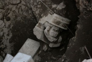 A escasos 50 centímetros fueron apareciendo los elementos señalados, la escultura del dios viejo o del fuego (la más grande de su tipo en Teotihuacan) y el fragmento de una estela de 80 kilos, más otros objetos de piedra verde o pizarra, como cuentas y placas y concentraciones de conchas marinas.