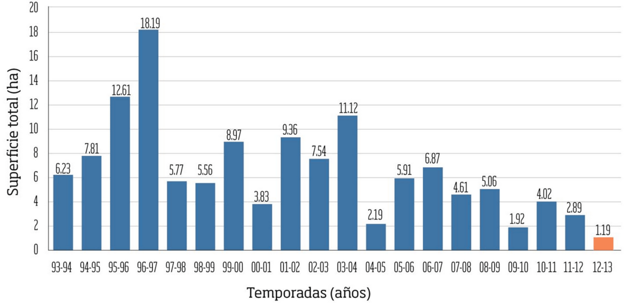 ZITÁCUARO, Michoacán.- El monitoreo llevado a cabo durante la temporada 2012-2013 por la Comisión Nacional de Áreas Naturales Protegidas (CONANP) y la Alianza WWF-Telcel, a través de la Dirección de la Reserva de la Biósfera Mariposa Monarca, encontró que la superficie forestal ocupada por las colonias de estas mariposas en diciembre de 2012 ha sido la más baja de las últimas dos décadas. Durante la segunda quincena de diciembre de 2012, el monitoreo registró 9 colonias de hibernación, que ocuparon una superficie total de 1.19 hectáreas (ha) de bosque, cifra que representa un decremento de 59% respecto a las 2.89 ha ocupadas en diciembre de 2011.