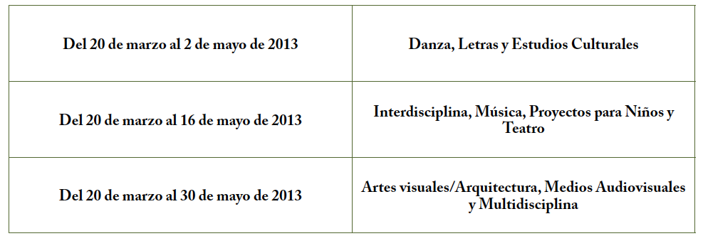 Las disciplinas de atención son: Arquitectura, Artes Visuales, Danza, Estudios Culturales, Interdisciplina, Letras, Medios Audiovisuales, Multidisciplina, Música, Teatro y Proyectos para Niños.