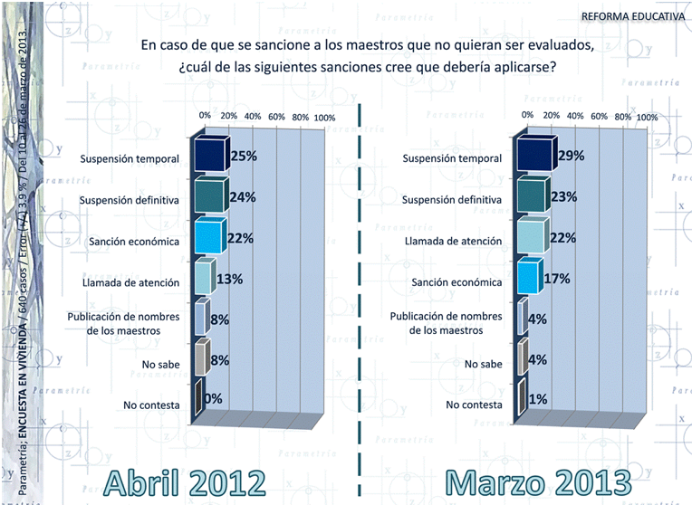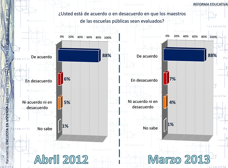Parametría es una empresa dedicada a la investigación estratégica de la opinión y análisis de resultados. En su portal de internet, dicha empresa informa que en el ejercicio que realizaron en abril de 2012, nueve de diez mexicanos manifestaron estar de acuerdo con que los maestros se sometieran a un examen para conocer su capacidad de enseñanza.