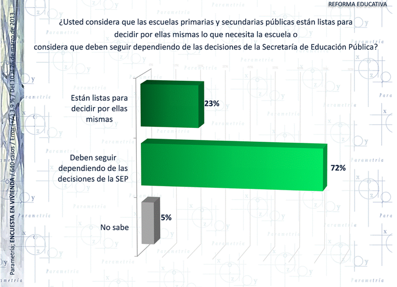 Cabe recordar que dentro de la reforma educativa también se promueve la autonomía de gestión de las escuelas, con ello la comunidad escolar podrá decidir cómo y dónde desea invertir los recursos públicos. Sobre este tema sólo dos de cada diez mexicanos (23 %) apoyan esta medida y confían en que las escuelas puedan decidir sobre sus propias necesidades. Siete de cada diez, opinan que las primarias y secundarias públicas deben seguir dependiendo de las decisiones de la SEP, reflejando la incredulidad que aún se tiene de la capacidad de autogestión de los centros educativos.