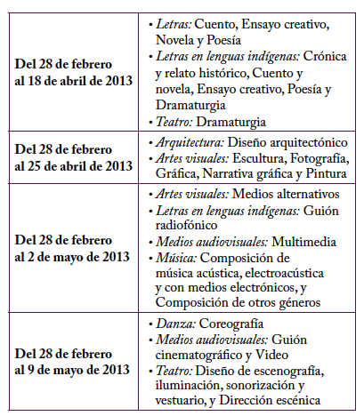 Algunos de los requisitos presentados son ser mexicano de entre 18 y 34 años de edad, al 9 de mayo de 2013, presentar un proyecto individual, que sea exclusivamente de creación de obra y que se desarrolle durante el periodo de la beca y registrar su postulación en línea y cargar sus archivos en el sitio del FoNCA en las fechas establecidas para cada especialidad.