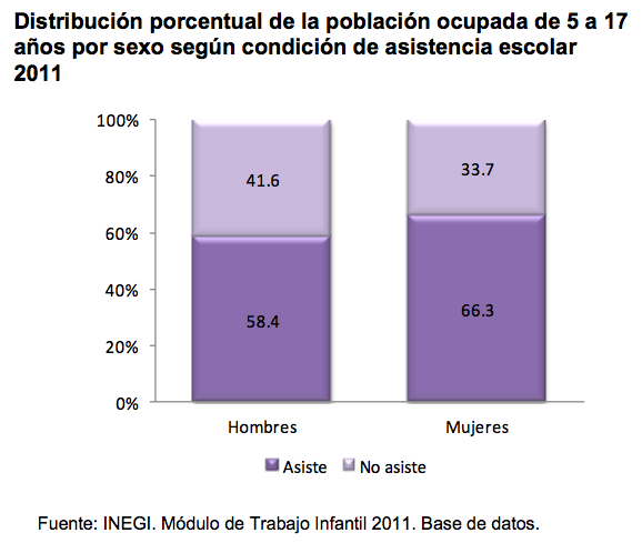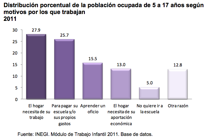 En México durante el año 2011, 3 millones de niños, niñas y adolescentes de 5 a 17 años realizaron alguna actividad económica, lo que representa una tasa de ocupación de 10.5 por cada 100 menores, así lo dio a conocer el Instituto Nacional de Estadística y Geografía (INEGI), con motivo del 12 de junio, Día Mundial contra el Trabajo Infantil.