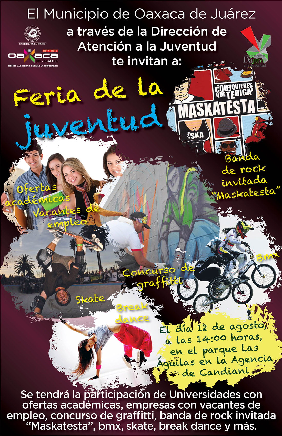 Asimismo se contara con la participación de 3 bandas de Rock oaxaqueñas; exposición de Break Dance y danza moderna; exposición de deporte extremo (BMX y SkateBoard).