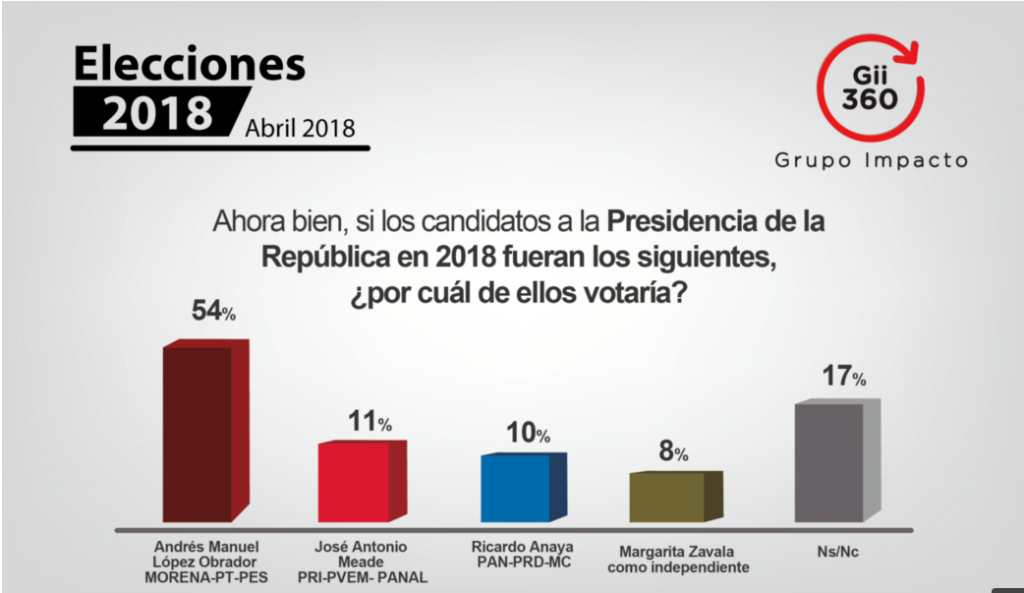 El asunto no es distinto para la elección a Presidente de México, en la cual Andrés Manuel López Obrador rebasaría incluso la línea de la mayoría, alcanzando los 54 puntos; por 11 de José Antonio Meade y 10 de Ricardo Anaya.