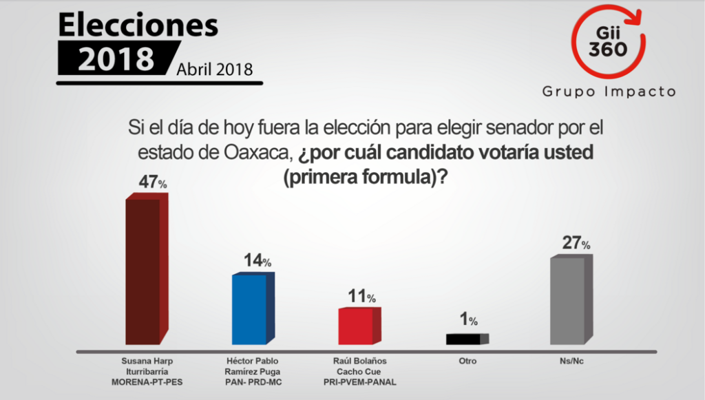 (www.eloriente.net, México, a 24 de abril de 2018, por: Sergio Méndez Bazán).- Prácticamente caminando el partido político Morena ganaría la elección al Senado de la República en Oaxaca, de acuerdo a los datos dados a conocer por Grupo Impacto Gii360, según encuesta telefónica levantada entre el 13 y el 17 de abril pasado y cuyos resultados en resumen pueden consultarse en su página de internet.