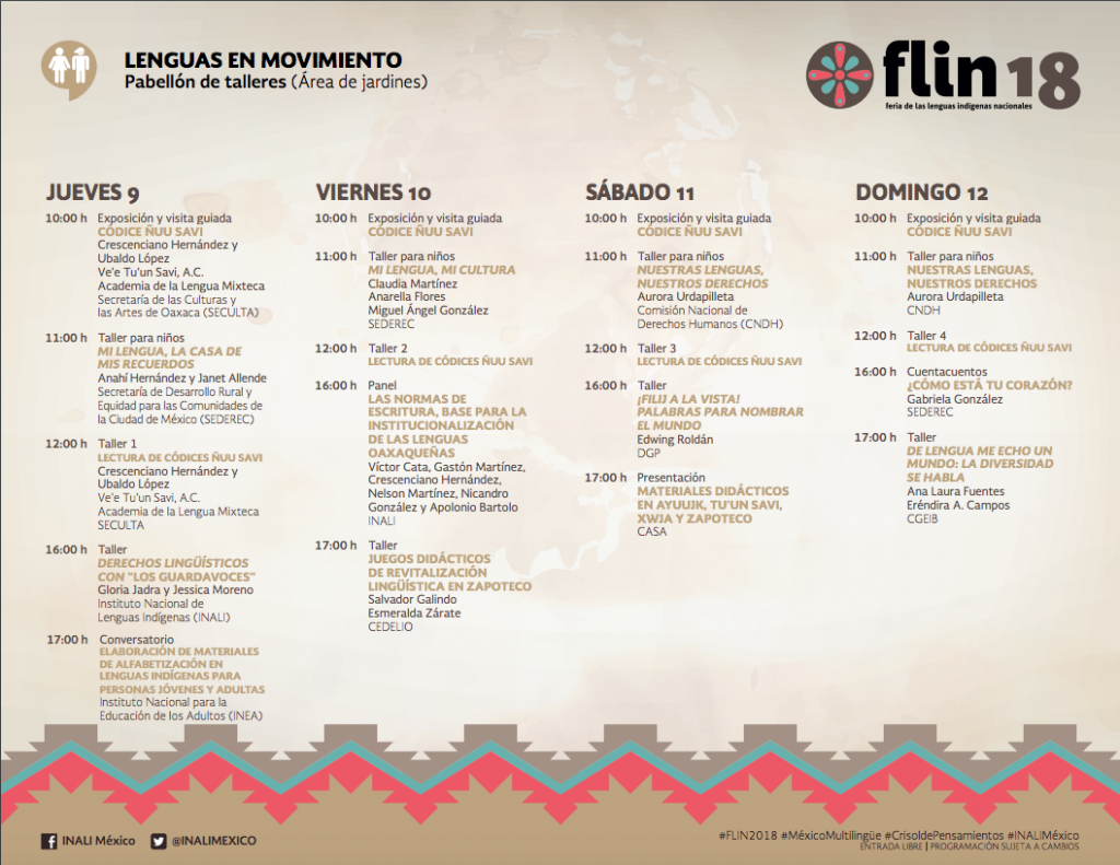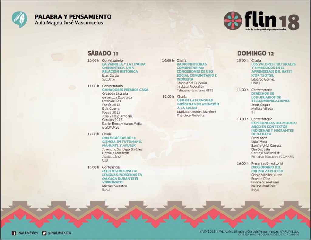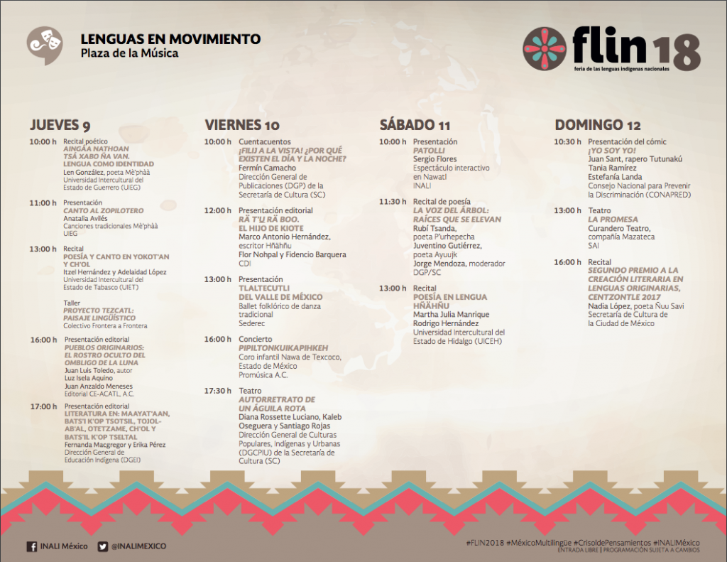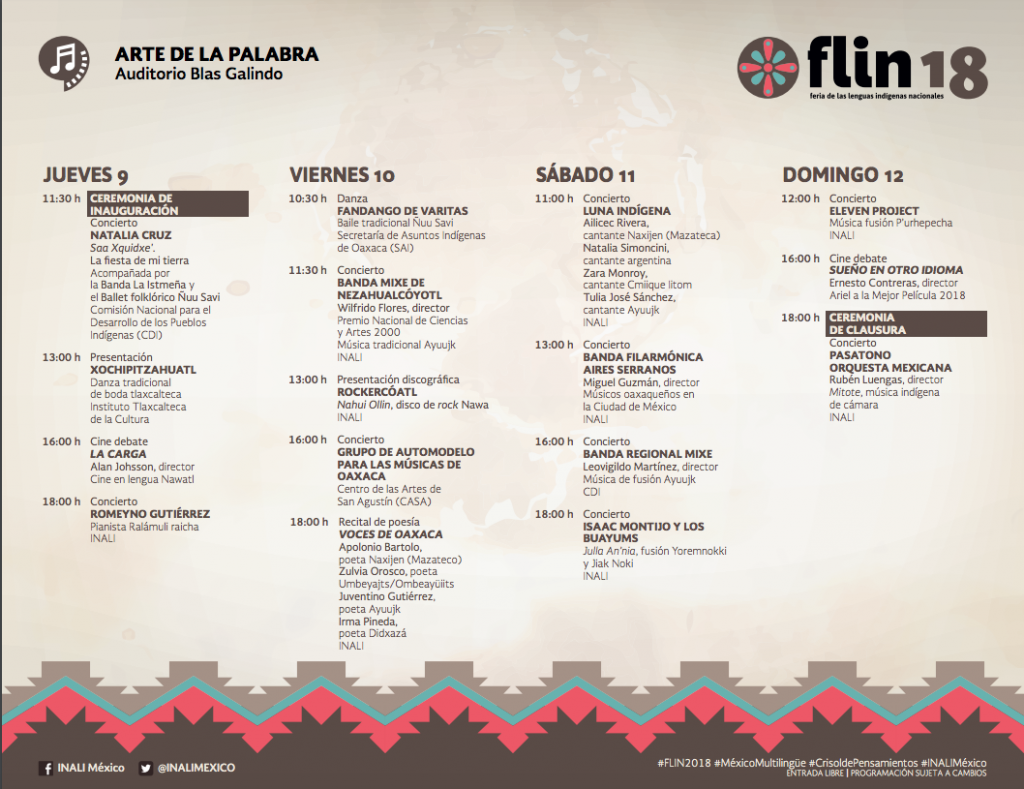 A fin de dar continuidad a la participación activa de la población indígena en el desarrollo de actividades, se realiza la segunda emisión de la Feria de Lenguas Indígenas Nacionales (FLIN) 2018, México multilingüe, crisol de pensamientos, del 9 al 12 de agosto, con sede nuevamente en el Centro Nacional de las Artes, y este año tiene como invitado al estado de Oaxaca a través de sus lenguas. El objetivo de la FLIN 2018 es visibilizar el potencial creativo de los hablantes de lenguas indígenas a través de los bienes, productos y servicios multilingües que se generan para construir puentes de comunicación que permitan el diálogo, intercambio y el fortalecimiento de la producción cultural comunitaria.