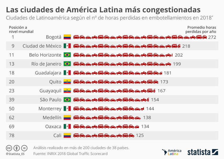 Según un nuevo estudio de INRIX, una empresa de análisis del sector del transporte, Bogotá fue la ciudad en 2018 con los peores embotellamientos tanto de América Latina como a nivel mundial. Los problemas de congestión vial en la capital de Colombia son tan serios que, tal y como muestra esta infografía elaborada por Statista, los conductores bogotanos desperdiciaron en promedio 11 días o 272 horas al año en el tráfico de la ciudad.
